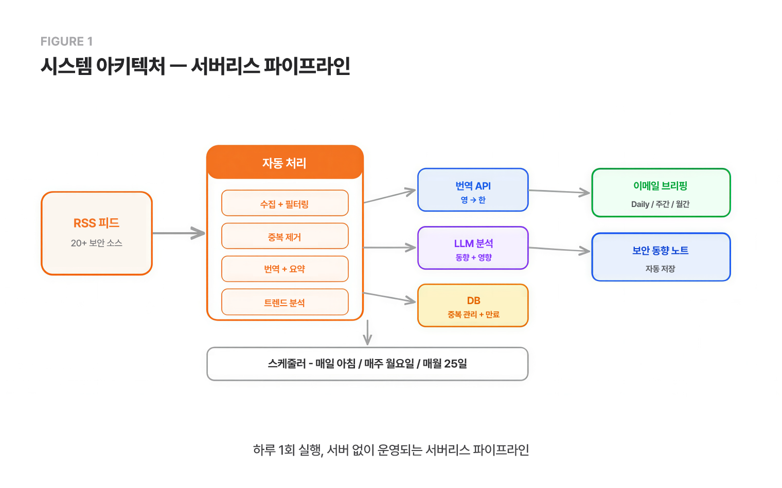 최종 산출물은 4개의 자동 파이프라인입니다. Daily 브리핑은 매일 아침 8시에 도착합니다. 20개 넘는 보안 피드에서 기사를 수집하고, 13개 분야 키워드 필터링과 해시 기반 중복 제거를 거친 뒤, 영문 기사는 DeepL로 번역해서 분야별로 정리된 이메일을 보냅니다. 주간 트렌드는 매주 월요일, 월간 트렌드는 매월 25일에 발송되는데, GPT-4o-mini가 분야별 동향 분석과 산업 영향까지 붙여줍니다. 전부 AWS Lambda와 EventBridge로 돌아가고, 서버 관리는 없습니다.