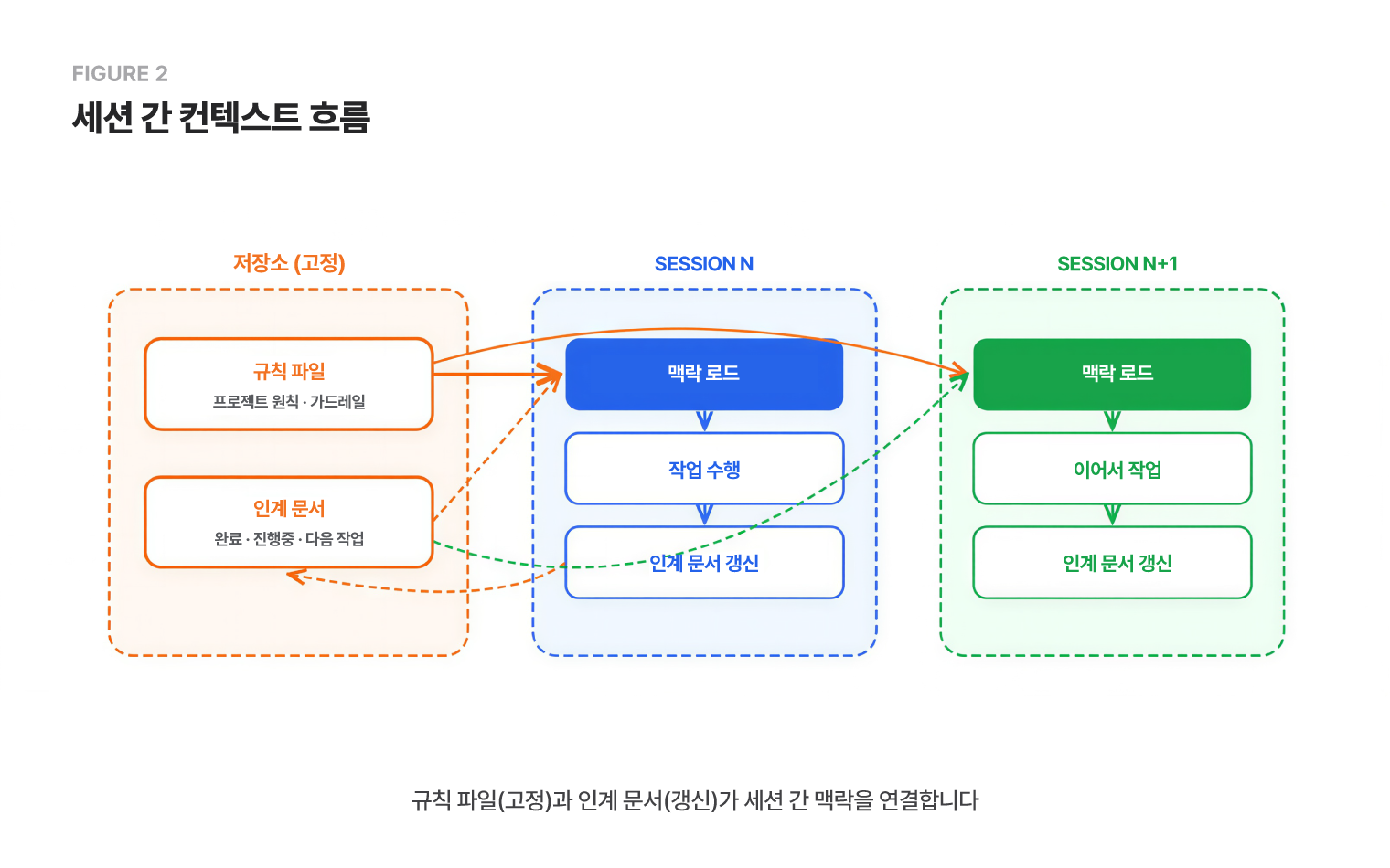 해결책은 의외로 익숙한 곳에서 나왔습니다. 야간 근무자가 주간 근무자에게 남기는 인수인계 노트(handoff). 업무에서 늘 해오던 것인데, AI 세션 간 맥락 전달에도 같은 원리가 통하겠다는 생각이 들었습니다. 게다가 이미 AI를 통해 협업 개발을 진행하고 있는 여러 팀에서도 잘 활용하고 있는 방법이더라고요. 여기에 AI 에이전트가 매 세션 시작 시 읽을 수 있는 규칙 파일을 추가해서, 두 종류의 파일을 만들었습니다.