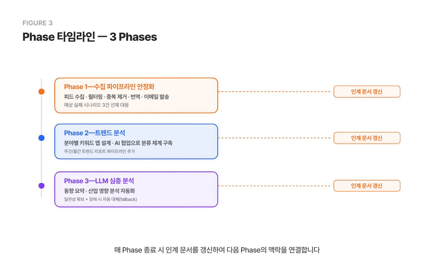 Phase 3에서는 GPT-4o-mini를 파이프라인 안에 넣어 동향 요약과 산업 영향 분석을 자동화했습니다. 이 과정에서는 과도한 확대 해석을 방지하기 위해 모델 temperature를 0.3으로 낮춰 일관성을 잡고 응답 포맷을 JSON으로 고정해 파싱 실패를 방지하고, API가 죽어도 기존 템플릿으로 대체되는 fallback을 넣었습니다. 각 Phase는 충분히 작은 세션과 그 하위의 태스크 단위로 분해되고, 세션이 끝날 때마다 인계 문서(handoff)를 갱신했습니다. 단순히 "뭘 했다"만 적는 게 아니라, "이 Phase에서 내린 판단의 근거"와 "다음 Phase에서 결정해야 할미결 사항"도 함께 기록하면서요. 위 작업을 통해 하나의 컨텍스트 안에서 AI가 일할 수 있는 환경을 더 쾌적하게 만들어주고 작업의 품질과 일관성을 동시에 확보해 보려는 시도를 해보게 된 것이라고 할 수 있죠.